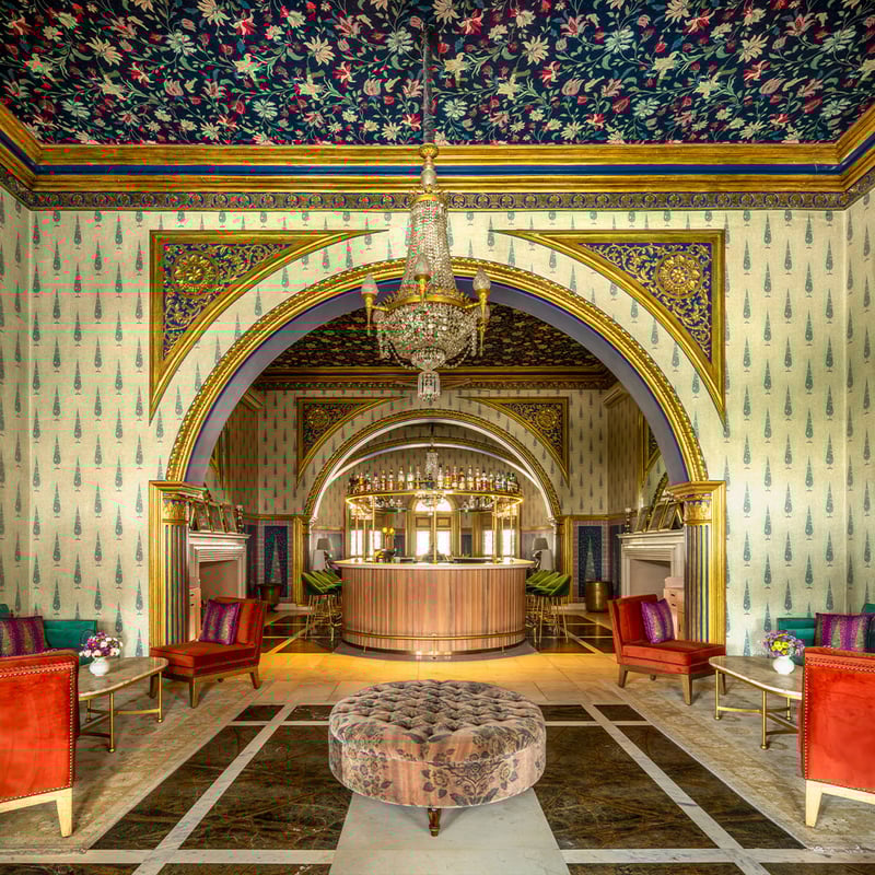 Demeure royale édifiée en 1729, le Rajmahal Palace appartient toujours à la famille régnante de Jaipur et accueillit jadis la reine Élisabeth II. Ses treize suites, habillées de papiers peints artisanaux et de velours, déploient une esthétique digne de Wes Anderson—symétries audacieuses, couleurs vives, lustres scintillants. La table 51 Shades of Pink célèbre la cuisine traditionnelle de Jaipur, tandis que la piscine Art déco s'ouvre sur des jardins soignés.