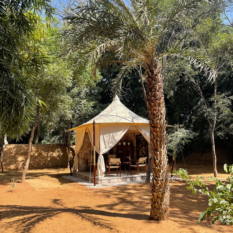Dix suites sous tente climatisées, tendues de coton épais et décorées dans un style mêlant héritage moghol et colonial britannique, bordent la réserve de Ranthambore, sanctuaire du tigre du Bengale. Safaris en 4x4, randonnées à dos de chameau vers le fort millénaire et soins dans la tente spa rythment les journées ; le soir, un feu en plein air précède le dîner sous toile, préparé à partir des potagers du domaine. L'adresse des amoureux de la vie sauvage en quête de confort absolu.