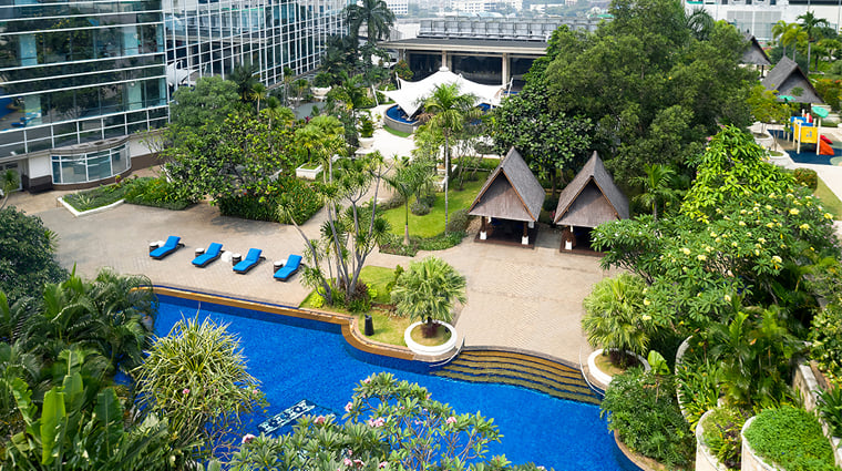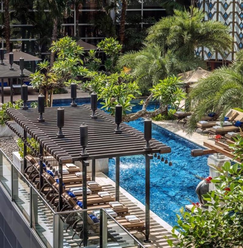 Les intérieurs signés Alexandra Champalimaud évoquent le passé de Jakarta comme port d'épices à travers dorures, lustres imposants et une remarquable collection d'art indonésien — dont un ensemble gamelan grandeur nature à l'entrée. Les 125 suites de plus de 60 mètres carrés disposent de salles de bain en marbre avec baignoires îlots. La piscine tropicale dessinée par Bill Bensley, cernée de frangipaniers et de torches, et un spa aux loungers à thérapie vibratoire séduisent les voyageurs d'affaires en quête de raffinement.
