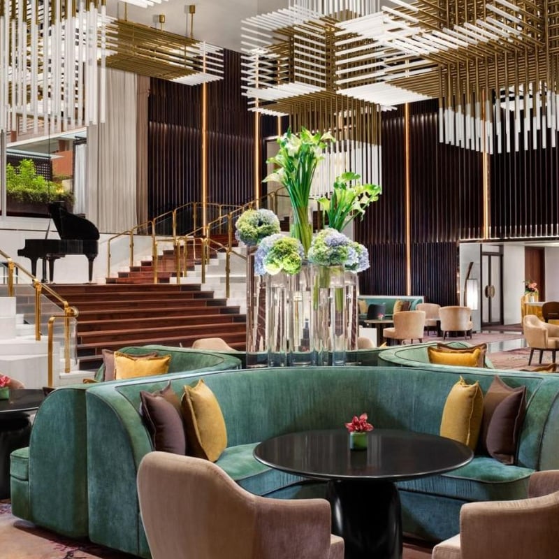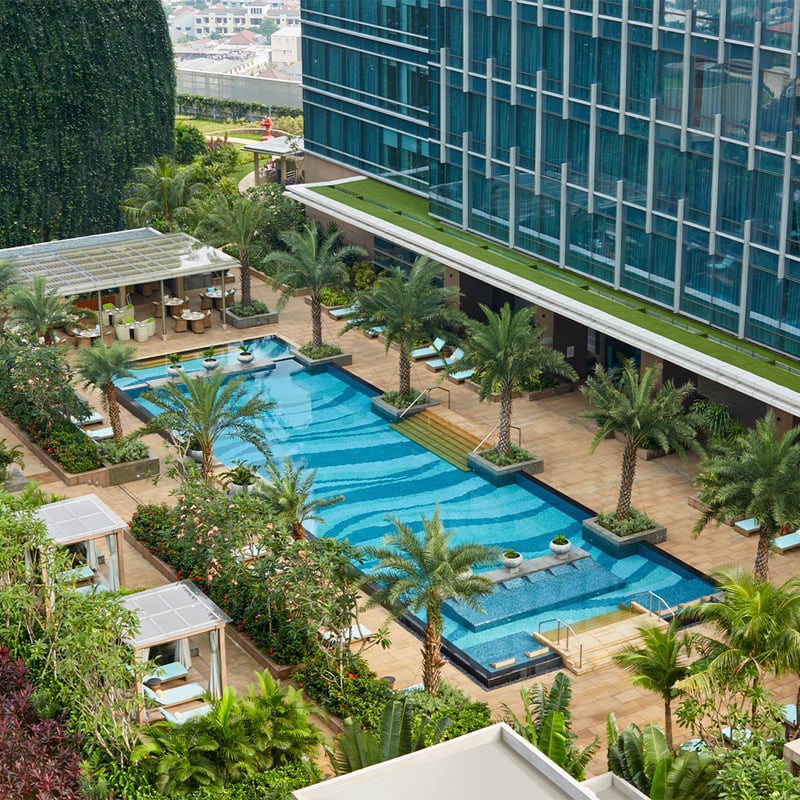 Dominant le quartier d'affaires de Sudirman du haut de ses soixante-cinq étages, The Langham déploie une élégance européenne sur l'horizon de Jakarta. Dans le hall, un lustre Lasvit composé de 3 000 papillons de verre rend hommage à la forêt tropicale indonésienne. La table T'ang Court prolonge l'adresse triplement étoilée de Hong Kong, tandis que la piscine chauffée du 63e étage—la plus haute de la capitale—offre des panoramas saisissants aux voyageurs en quête de raffinement urbain.