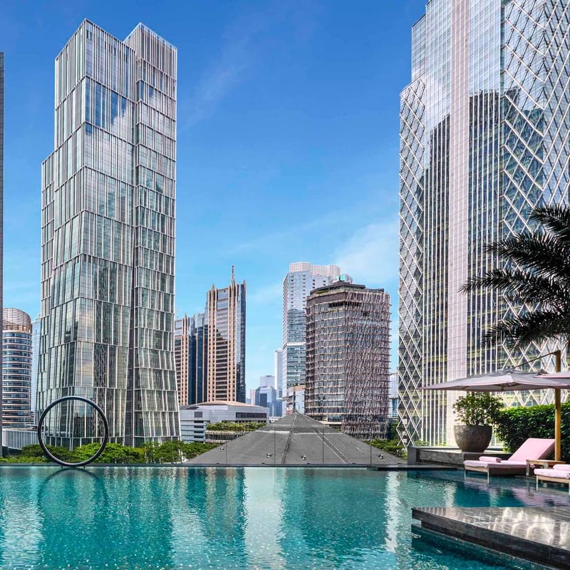 Installé aux derniers étages de la Luminary Tower, parmi les plus hauts immeubles d'Indonésie, cet établissement de 158 chambres cultive un luxe aérien et discret. Hirsch Bedner Associates a composé des intérieurs épurés, murs blancs, boiseries chaleureuses et touches bleutées. Au 71e étage, la piscine s'encadre dans l'armature d'acier de la tour ; au 90e, le restaurant Keyaki du chef Kunihiro Moroi propose sashimi de saumon en gaufrettes monaka, tandis qu'Eden décline ses cocktails dans un jardin botanique suspendu.