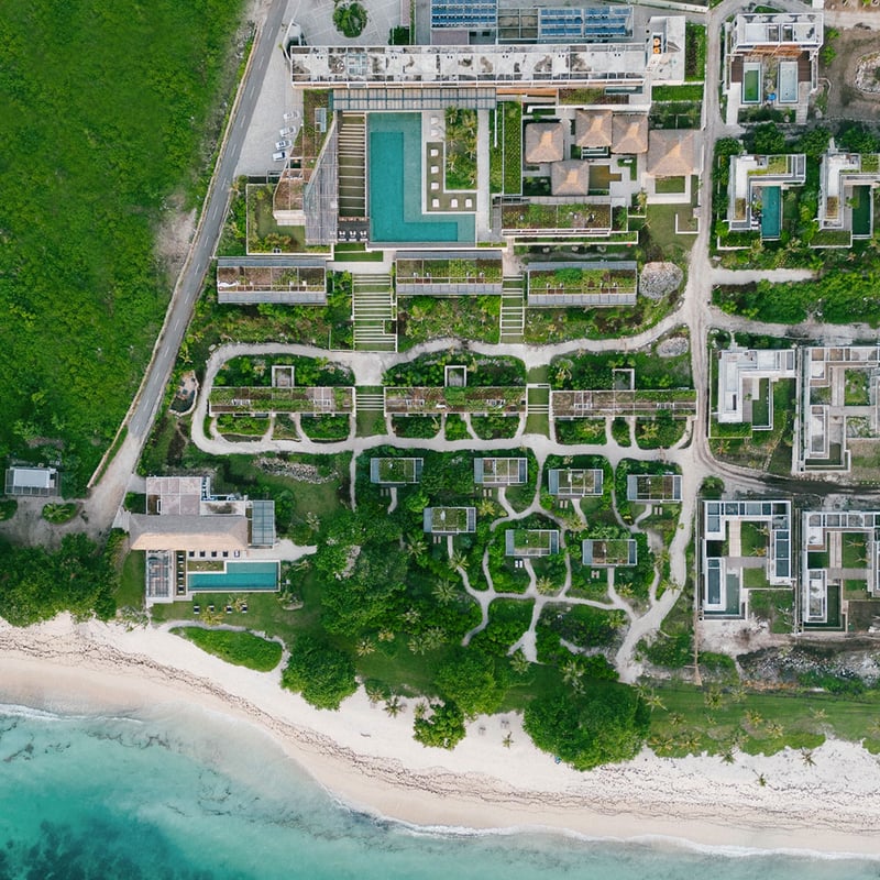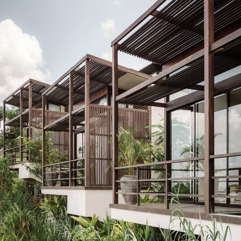 Sept villas cubiques et épurées, conçues par des architectes indonésiens dans l'esprit des maisons Lumbung traditionnelles, se dressent sur pilotis au-dessus d'espaces de vie posés à même le sable. Bois, pierre et béton d'origine locale ancrent l'ensemble dans le paysage, tandis qu'une piscine à débordement de 35 mètres longe 300 mètres de plage privée. Au restaurant Anakampung, le barbecue en bord de mer grille les prises du jour sous les étoiles.