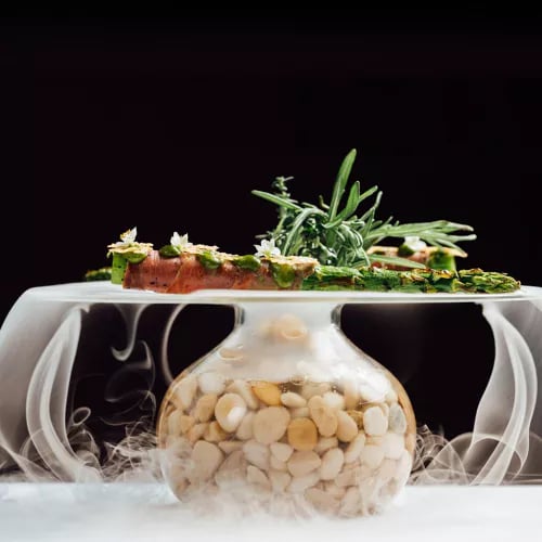 Dans un manoir du XVIIIe siècle reconverti en hôtel de charme, Blanc déploie sa salle aux murs bleu roi, volets blancs et arbre sculptural en son centre. Le menu dégustation en huit services tisse des ingrédients asiatiques en compositions d'une précision remarquable, culminant avec des desserts d'exception. Une table distinguée par le Guide Michelin, idéale pour les dîners d'apparat.