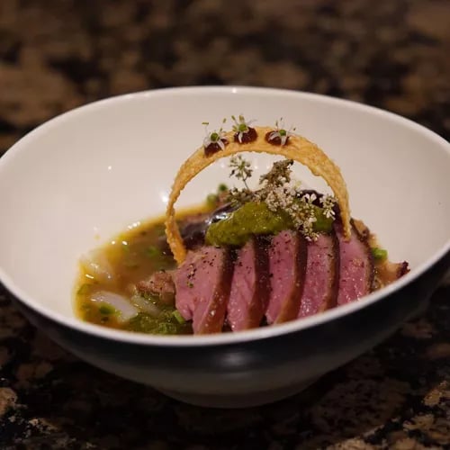 Une vitrine de maturation accueille les convives dès l'entrée, annonçant l'esprit résolument carné de cette table perchée au neuvième étage d'un hôtel au design affirmé. Sous la supervision du chef Benny Yeoh, les viandes — bœuf affiné à sec ou sous vide, agneau, magret de canard — passent sur les braises avec précision. Le service attentionné oriente les choix, et le tiramisu conclut le repas avec justesse.