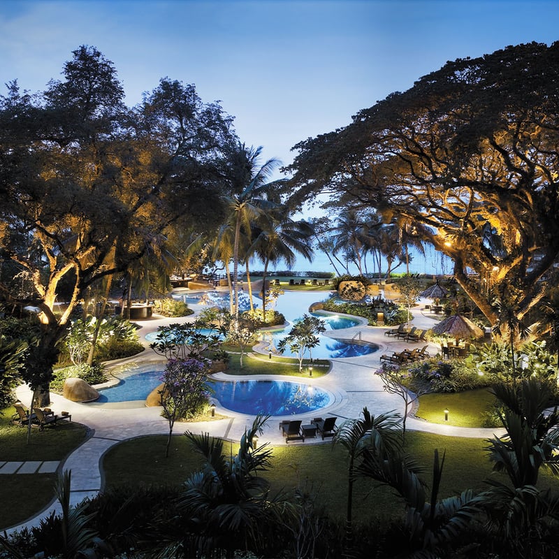Sur trente hectares paysagers bordant la célèbre plage de Batu Ferringi, ce complexe de 304 chambres décline l'héritage Minangkabau à travers boiseries, cotonnades et satins éclatants. Trois piscines jalonnent les jardins tropicaux, tandis que le plus grand spa de Penang—onze villas privées dédiées aux soins traditionnels chinois et malaisiens—attire les amateurs de bien-être. Randonnées en jungle et sports nautiques complètent l'expérience balnéaire.