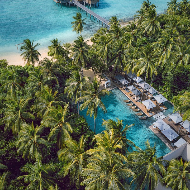 Implanté dans la réserve de biosphère UNESCO de l'atoll de Baa, ce Four Seasons conjugue préservation marine et bien-être holistique avec une ampleur rare. Son centre de découverte océanique — le plus vaste des Maldives — propose plantation de coraux et alertes raies manta, tandis que le spa déploie ses soins ayurvédiques entre pavillons sur pilotis au plancher de verre et jardins médicinaux. Le sous-marin DeepFlight emmène les couples à 36 mètres de profondeur.