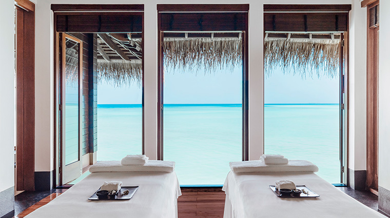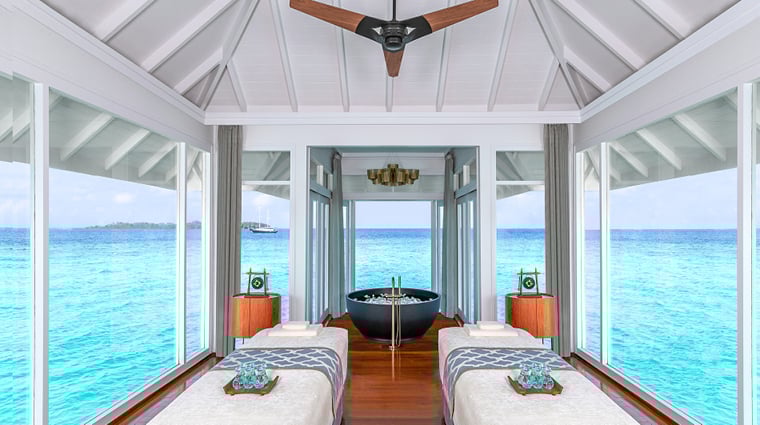 Flottant au-dessus du lagon, ce sanctuaire circulaire signé Kerry Hill Architects s'atteint par une passerelle traversant les eaux turquoise. Premier spa maldivien à proposer les soins biologiques Bamford, l'établissement aligne neuf cabines selon les points cardinaux. Le rituel signature de cent cinquante minutes mêle shiatsu et techniques suédoises, respirations guidées et bain apaisant, tandis que le soin maldivien associe gommage à la noix de coco fraîche et cataplasmes de sable chaud.