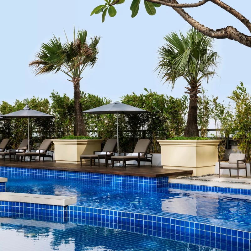 La tour signée Arquitectonica s'élève sur trente étages au-dessus du quartier financier de Makati, ses intérieurs conçus par Bent Severin International mêlant références culturelles philippines et lignes contemporaines dans 280 chambres aux baies vitrées panoramiques. Une piscine bordée de palmiers et le Fairmont Spa complètent l'offre bien-être, tandis qu'un accès privilégié au Raffles voisin ouvre les portes du Writers Bar et du Long Bar orné d'œuvres d'art.