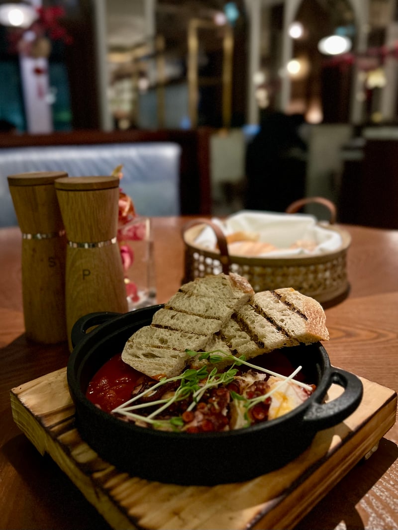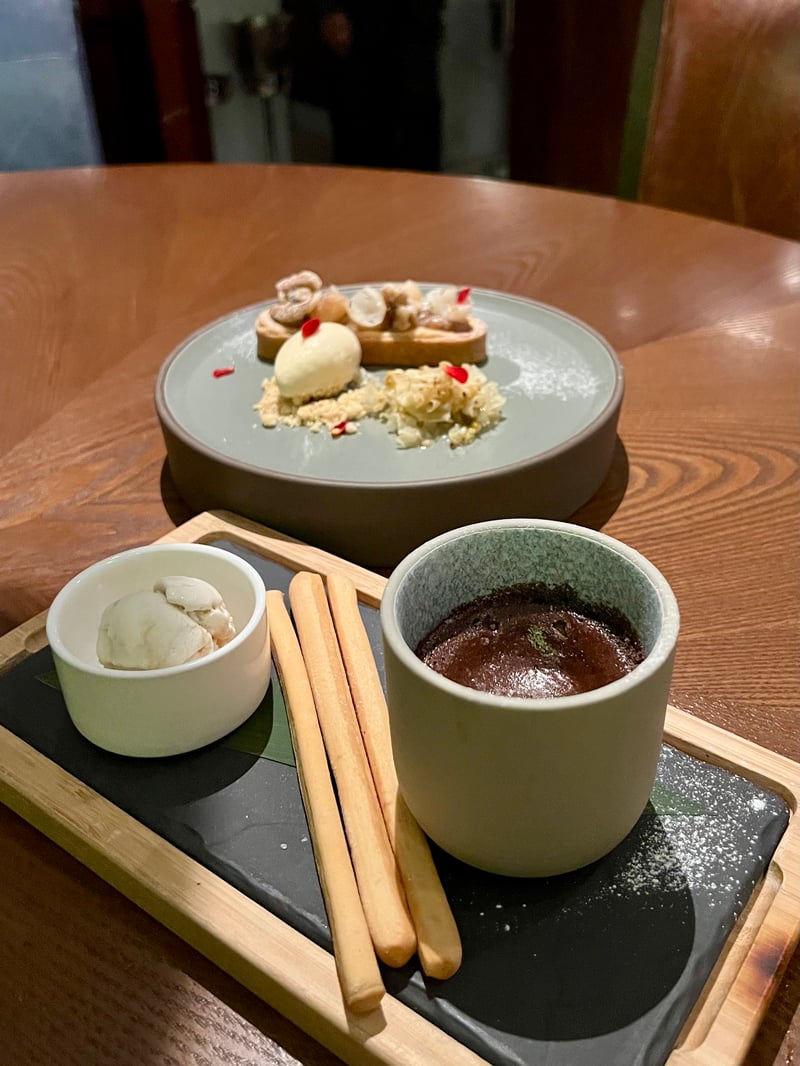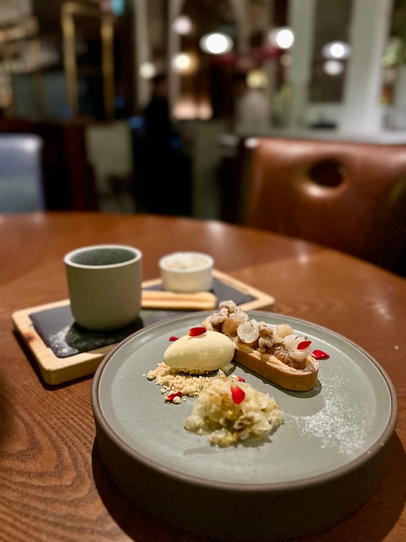Pour finir, le dip de chocolat chaud Valrhona avec du sel de mer, des bâtonnets de pain et de glace à la banane créait un contraste de textures et une explosion de gourmandise qui stimulaient les papilles, tandis que la tarte aux longanes avec des noix de pécan offrait une touche sucrée et croquante, parfaitement équilibrée, clôturant notre soirée sur une belle note.