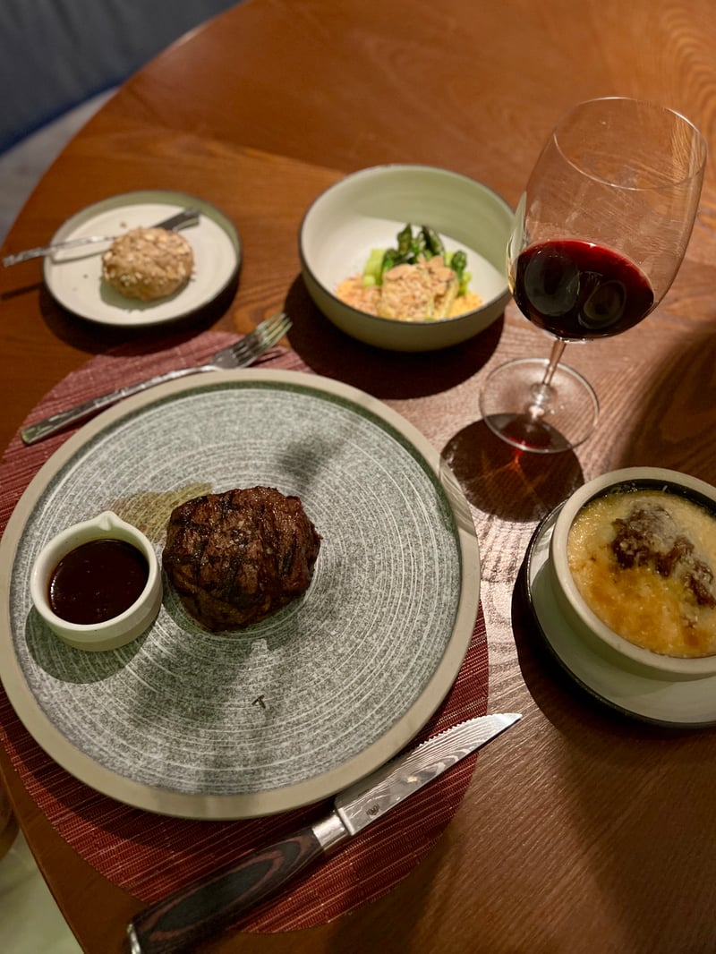 Le plat principal, un filet de bœuf Black Angus grillé, était un chef-d'œuvre de tendresse, accompagné d'une savoureuse sauce au poivre noir, chaque bouchée était un pur délice. Les coquilles saint-jacques de Hokkaido poêlées, posées sur un lit de brandade de morue et de betteraves caramélisées, fusionnaient textures et saveurs à la perfection. Les accompagnements n'étaient pas en reste, avec une purée gratinée aux oignons dorés et au fromage Gruyère, et des asperges vertes à la vapeur, rehaussées d'amandes grillées et enveloppées de sauce hollandaise, apportant une légèreté bienvenue à notre repas.