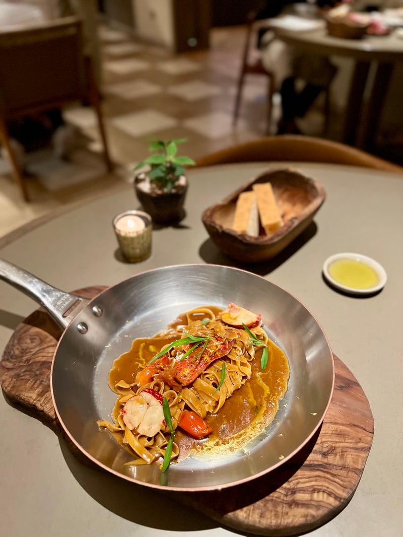 Nous avons ensuite poursuivi avec deux plats signatures qui témoignaient du savoir-faire du chef. Les Tagliatelle all'Astice, servies dans une élégante poêle en cuivre, associaient la délicatesse du homard bleu à une sauce onctueuse et parfumée, relevée par l'estragon et la douceur des tomates confites. Un plat d'une grande générosité, où chaque bouchée révélait un équilibre parfait entre richesse et fraîcheur. Dans un tout autre registre, la Carpricio, pizza napolitaine aux bords dorés et gonflés, célébrait la tradition italienne avec une base de tomates San Marzano, de mozzarella Fior di Latte fondante, et une combinaison gourmande de saucisse napolitaine, champignons fumés et câpres de Salina.