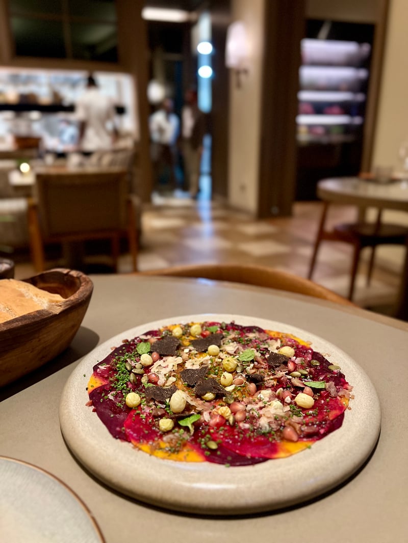 Notre dîner chez Fiamma a débuté avec une sélection d'entrées raffinées, mettant en avant la richesse des saveurs et des textures. Le Carpaccio di Zucca a ouvert le bal avec ses couleurs éclatantes et son jeu subtil de contrastes : les fines tranches de potiron et de betterave, sublimées par le croquant des châtaignes et la douceur acidulée de la grenade, étaient relevées par l'intensité de la truffe noire et la profondeur d'un vinaigre balsamique vieilli. Une touche de menthe venait rafraîchir l'ensemble avec élégance.