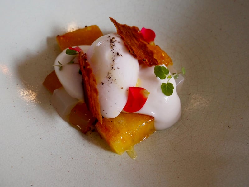 Nous passons ensuite aux choses sérieuses avec le plat principal à base de canard, le tout en deux préparations : un filet simplement rôti mais aussi la cuisse confite sous forme d'une petite croquette, le tout parfumé à la groseille et accompagné d'une purée de pommes de terre vitelotte. Le plat ne manque pas de gourmandise et la présentation, tout comme les plats précédents, est d'une esthétique rare.