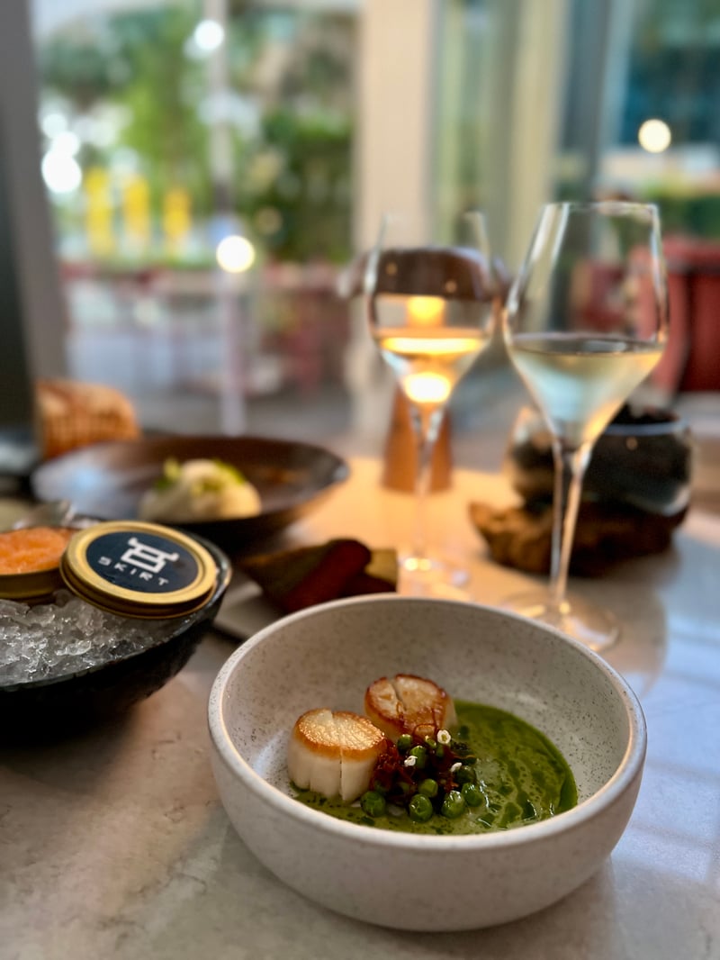 Entièrement repensé, SKIRT dévoile un nouveau décor chic et sophistiqué qui mêle chaleur et élégance. Les teintes profondes de prune et de cerise apportent une touche feutrée à la salle, inondée de lumière naturelle grâce aux immenses baies vitrées offrant une vue dégagée sur la marina paisible de Sentosa. Au centre de l'espace, la spectaculaire cuisine ouverte en marbre capte tous les regards : entourée de frigos de maturation et de grills, elle transforme chaque service en véritable performance culinaire. Dans cette atmosphère intimiste, contemporaine et raffinée, SKIRT incarne à la perfection l'art de la grillade version haut de gamme.