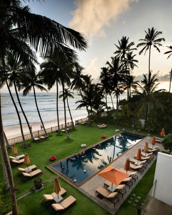 Dix chambres blanchies à la chaux contemplent l'une des plus longues plages de sable fin du sud, à moins d'une demi-heure du Fort de Galle, là où surfeurs et voiliers animent l'horizon. Les suites penthouse atteignent près de cent mètres carrés, tandis que le restaurant décline une cuisine sri-lankaise aux accents thaïlandais. Une navette relie la propriété sœur Kahanda Kanda pour varier les tablées. Piscine extérieure, spa et jardin complètent l'adresse, idéale pour les familles avec adolescents.