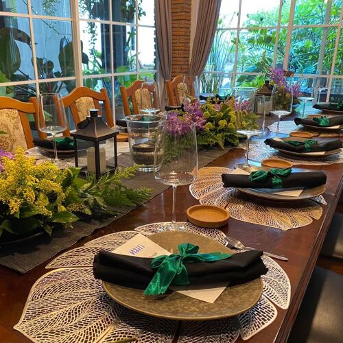 Sur la terrasse dominant le Mun, des sièges taillés dans des troncs sombres entourent des tables de bois brut où l'on vient admirer le fleuve avant le crépuscule. La cuisine célèbre l'Isan à travers des poissons locaux minutieusement désarêtés, accompagnés de légumes marinés maison à l'eau de coco fraîche. Le décor—boiseries noires rehaussées de rouge et d'or—rappelle l'ancienne province du Lan Chang, tandis que les légumes proviennent du potager du propriétaire.