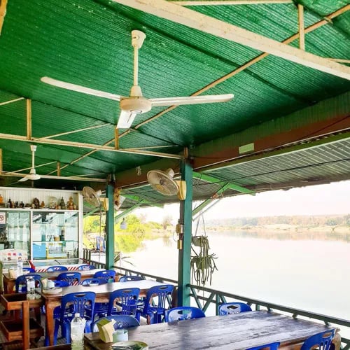 À la jonction du Mékong et de la rivière Mun, cette salle flottante ondule doucement au passage des embarcations de pêcheurs qui livrent leur prise matinale. La carte évolue au gré des arrivages : poissons de rivière cuisinés selon les traditions thaïlandaises locales, saveurs franches dont le piquant s'ajuste sur demande. Au crépuscule, les collines laotiennes s'embrasent à l'horizon tandis qu'une brise fraîche traverse la terrasse.