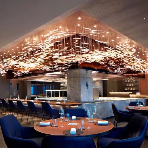 Au neuvième étage du Méridien, Akuna tire son nom du terme aborigène désignant l'eau courante — un concept matérialisé par 1 200 tiges lumineuses ondulant autour de la cuisine ouverte tel un ruisseau au crépuscule. Le chef Aisbett signe un menu dégustation étoilé où les codes européens se teintent d'inflexions vietnamiennes. Vins australiens et internationaux accompagnent cette table créative dominant le District 1.