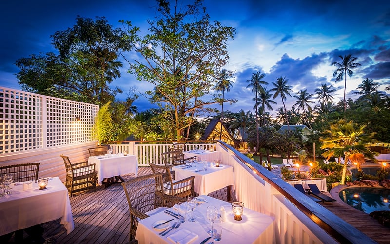 La culture villageoise fidjienne imprègne l'hospitalité locale. La cérémonie du sevusevu — offrande de racine de kava au chef — inaugure souvent le séjour des visiteurs. Les spectacles de meke et les festins lovo rythment les semaines. En cuisine, l'océan dicte les menus : poissons de récif, crabes de mangrove, kokoda préparé à la crème de coco fraîche. Le temps se mesure ici aux marées et aux couchers de soleil plutôt qu'aux horloges.