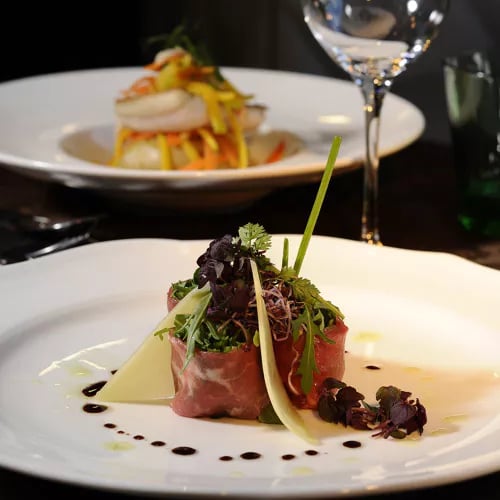 Face à la vieille ville, de l'autre côté de l'Inn, une salle épurée abrite une cuisine ouverte où les chefs orchestrent deux menus dégustation distincts, l'un végétarien, l'autre déclinant viandes et poissons. La tradition culinaire classique s'y affine de techniques contemporaines, révélant des assiettes telles que crevette alpine, blette, cacahuète et prune. Accords maison sans alcool disponibles aux côtés des vins.
