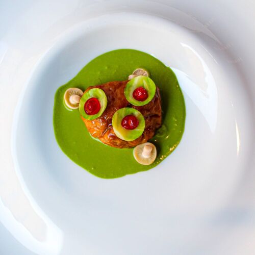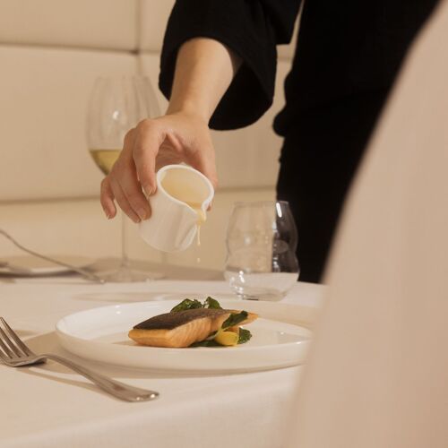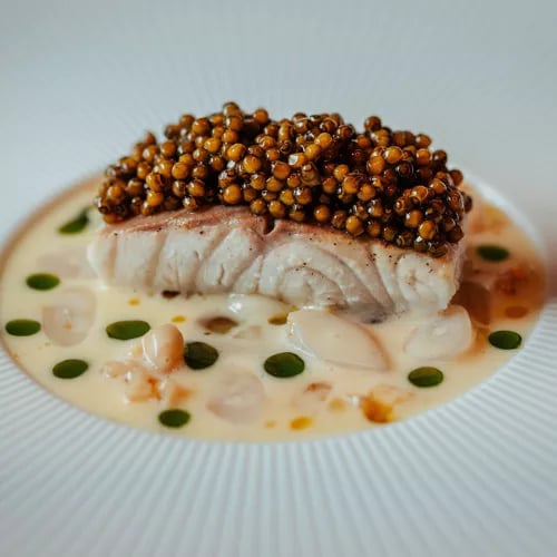 Johannes Nuding, passé par le trois-étoiles Sketch à Londres, orchestre cette table doublement étoilée avec seulement trois cuisiniers. Son menu en six services déploie une cuisine régionale d'une précision remarquable : turbot sauvage rôti sur l'arête, haricots borlotti, citron confit et câpres salées, nappé d'une sauce au vin classique. Sous un plafond de bois ancien, le bar voûté et la cave accessible prolongent l'expérience.