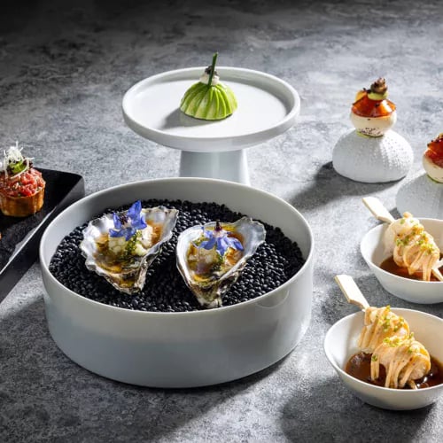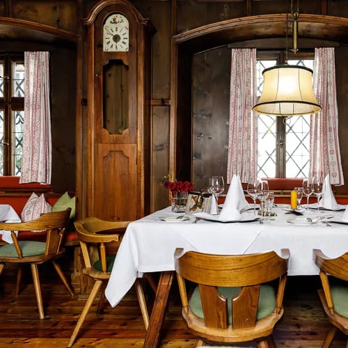 Sur le haut plateau de Seefeld, au sein de l'Interalpen-Hotel Tyrol, cette table étoilée installe ses convives face aux fourneaux, sur deux hauts comptoirs où le chef Mario Döring commente lui-même chaque assiette. La langoustine grillée au binchotan, accompagnée de carotte fermentée et de caviar d'omble, illustre une cuisine saisonnière aux accords francs et maîtrisés. Les desserts de Manfred Löschl—cheesecake au rhubarbe, chanvre et verveine—prolongent l'audace. Uniquement en soirée, du lundi au vendredi.