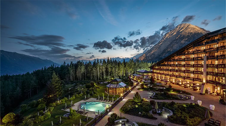 Dressé à 1 300 mètres d'altitude sur le plateau de Seefeld, cet imposant établissement de style chalet offre des panoramas alpins saisissants depuis ses intérieurs lambrissés aux plafonds voûtés. Son spa de 5 300 mètres carrés abrite une piscine panoramique suspendue face aux sommets et un village de saunas avec grotte d'eau salée. Le restaurant Wintergarten propose une cuisine tyrolienne raffinée aux produits du potager, tandis que le domaine se prête au ski l'hiver comme à la randonnée l'été.