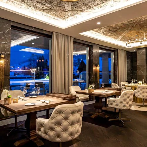 Derrière une vaste façade vitrée, Fux cultive depuis des années une cuisine fusion asio-européenne servie face à une cuisine ouverte où s'affairent les chefs. La carte des vins compte parmi les plus remarquables d'Autriche, avec une sélection de champagnes et de bourgognes d'exception. Le bar, élégant et feutré, prolonge la soirée d'un apéritif ou d'un dernier verre après une journée sur les pistes.