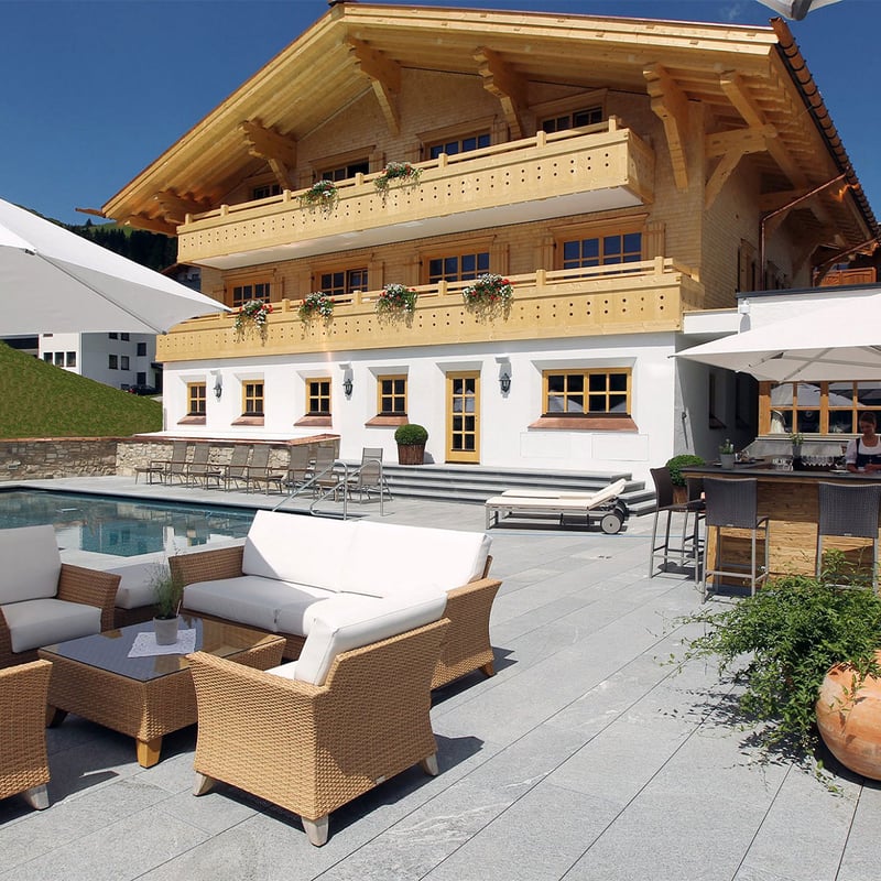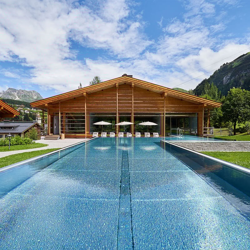 Sept chalets en bois s'étagent sur le plateau de l'Arlberg à plus de 1 700 mètres d'altitude, chaque chambre dotée d'un sauna privatif et d'un balcon contemplant le massif. Le décor oscille entre tradition alpine et lignes contemporaines, unifié par une profusion de bois noble. Un spa de trois étages avec hammam et doubles piscines complète l'ensemble, couronné par le Griggeler Stuba et ses deux étoiles Michelin.