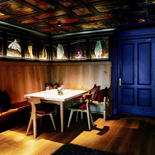 Installé dans l'historique Almhof Schneider, ce restaurant de saison hivernale se déploie en deux salles d'exception : Wunderkammer, imaginée par l'artiste Paul Renner, et Herbarium, ornée des gravures sur bois de Christian Thanhäuser. La carte célèbre la tradition autrichienne — goulasch Fiaker, Kaiserschmarrn, Beuschel au Riesling — tout en proposant du Wagyu, le tout accompagné d'une cave remarquable forte de plus de 1 200 références.