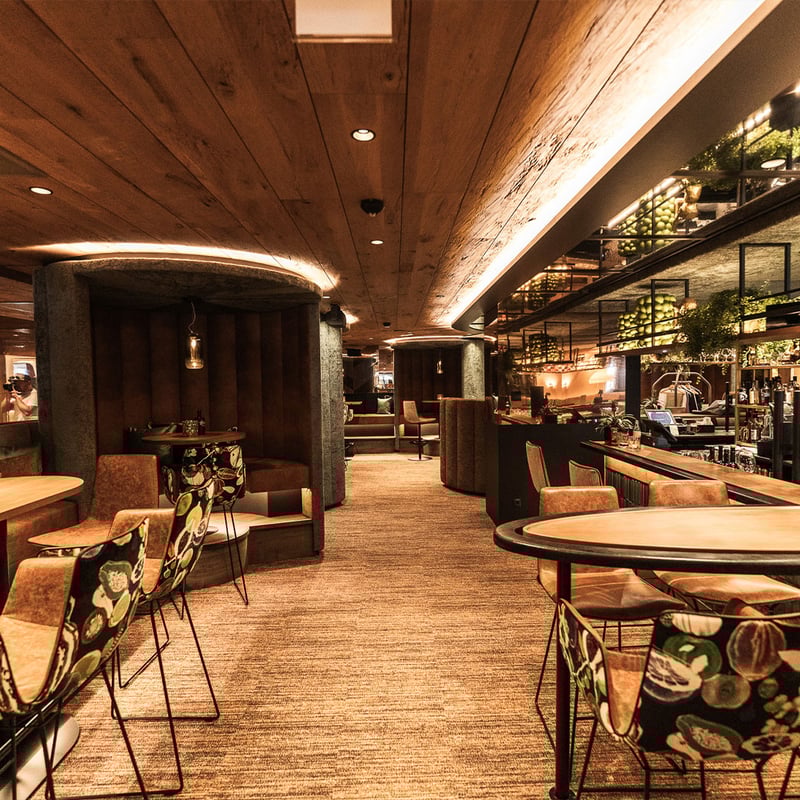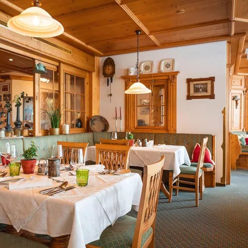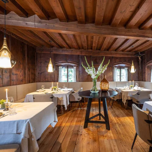 Quatre tables seulement occupent cette salle du XVe siècle, où boiseries d'époque et poêle ancien composent un décor d'une authenticité rare. Le menu dégustation, renouvelé au fil des saisons, met en lumière les produits régionaux tyroliens, accompagnés d'accords vineux puisés dans une cave richement garnie. Une adresse confidentielle au sein de l'hôtel Der Böglerhof, pour les amateurs de gastronomie alpine intimiste.