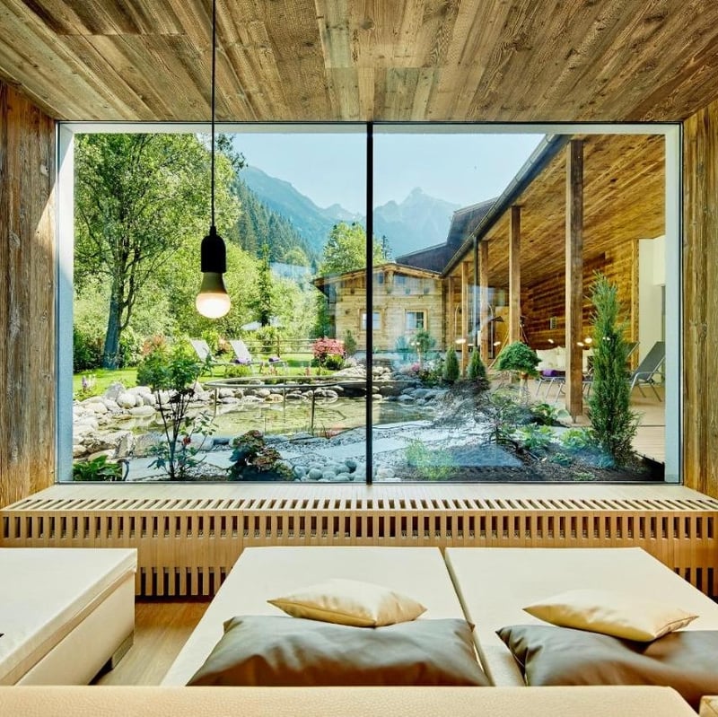 Déployé sur un vaste domaine alpin face aux sommets de Tux, ce refuge de 60 chambres cultive l'élégance montagnarde — lambris d'épicéa, étoffes écossaises, touches de pommes de pin. La piscine panoramique en toiture offre un spectacle d'altitude, tandis que l'espace bien-être décline hammam, sauna et jacuzzi. Bassins intérieur et extérieur, jardins soignés et accueil des animaux séduiront familles et couples en quête d'immersion tyrolienne.