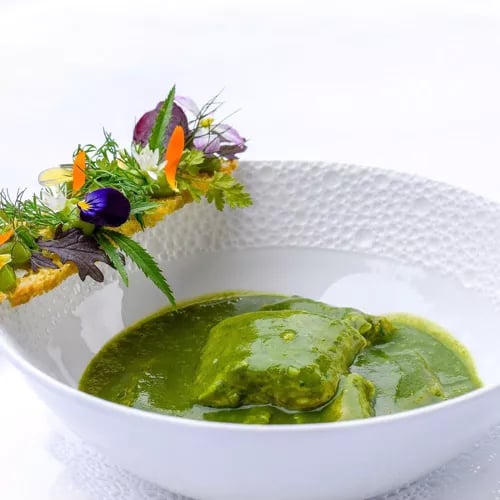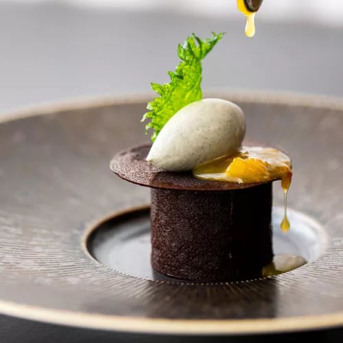 Dans l'écrin minéral du Botanic Sanctuary Hotel, le chef Gert De Mangeleer déploie une cuisine créative couronnée de deux étoiles Michelin, nourrie d'influences asiatiques et d'une exigence absolue. Son pigeon d'Anjou, rôti au foin puis saisi au binchotan devant les convives, accompagné de foie gras fondu et d'un jus à l'ail fermenté, illustre une maîtrise technique aussi audacieuse que précise. La table du chef permet d'observer cette virtuosité au plus près.