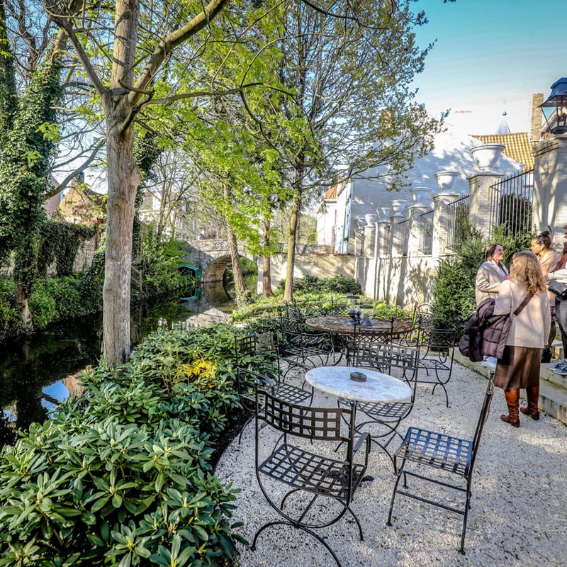 Ancien manoir Renaissance reconverti en adresse confidentielle de douze chambres, 't Fraeyhuis conserve sa cheminée monumentale et ses poutres apparentes, mariées aujourd'hui à un design contemporain et une photographie d'atmosphère. Le salon vitré s'ouvre sur un bar de jardin prisé des Brugeois. Face au parc du Minnewater et à son lac romantique, l'établissement séduit les couples en quête d'un refuge élégant aux portes du centre médiéval.