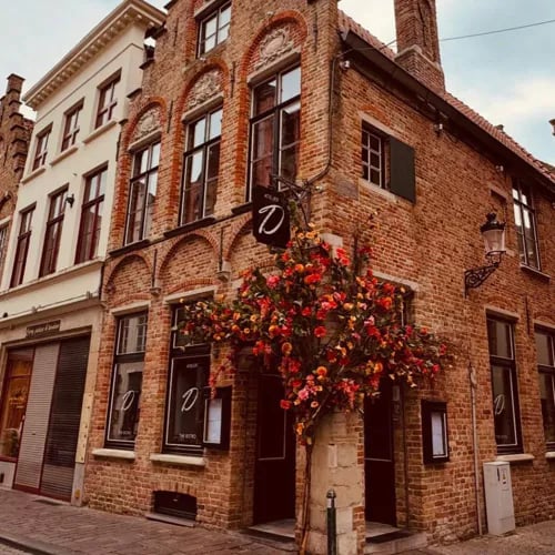Demeure patricienne du XVe siècle bordant le canal Den Dijver, l'établissement a accueilli David Hockney, Colin Farrell et la famille royale belge. Voûtes anciennes, poutres apparentes et escaliers de bois patiné habillent 45 chambres singulières, certaines ouvrant sur l'eau. En sous-sol, une piscine sous verrière, sauna et hammam composent un refuge intimiste. À table, le Restaurant Mémoire étoilé propose une cuisine belge contemporaine face au canal.