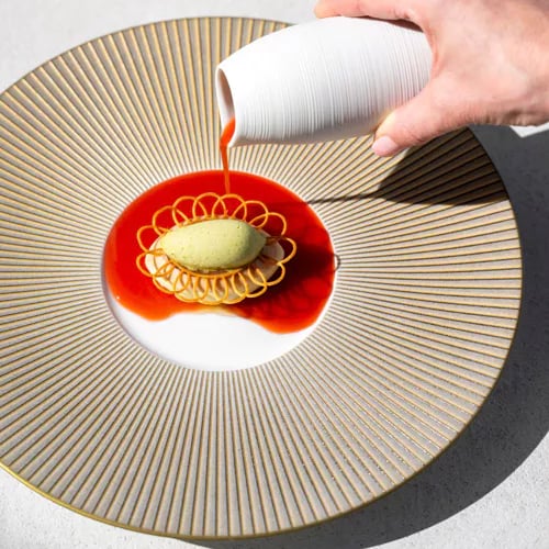 Dans un édifice du XVIIe siècle ponctué d'œuvres contemporaines, le chef Marcelo Ballardin puise dans ses racines italo-brésiliennes pour composer une carte étoilée d'une inventivité maîtrisée. Palourdes de mer du Nord, saveurs asiatiques, manioc sauvage d'Amazonie : chaque assiette oscille entre acidité franche et rondeur soyeuse, à l'image des langoustines en émulsion de carapaces relevées d'un chimichurri aux agrumes et fregola.