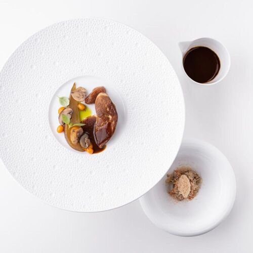 Dans une ancienne manufacture de lin au décor épuré, le chef Lode De Roover déploie une cuisine française étoilée où rigueur absolue et élans créatifs cohabitent. Sa langoustine grillée au barbecue, parfumée à l'huile de citronnelle et coiffée d'une mousse de petit-lait aux sucs de crustacés, illustre cette précision chirurgicale. Le canard de Barbarie, servi rosé avec un jus d'une intensité remarquable, confirme la maîtrise des cuissons et l'art du dressage.