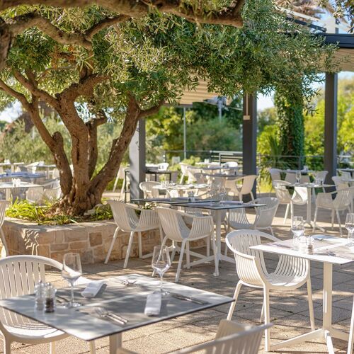 Sous les frondaisons d'oliviers centenaires, Otok déploie une cuisine insulaire où terre et mer dialoguent avec justesse. Les brochettes de crevettes aux tomates cerises, nappées d'une sauce crémeuse au citron, côtoient un poulet cuit sous brique aux accents rustiques. À l'étage, le bar sur le toit offre un panorama saisissant sur l'Adriatique et les toits ocre de Supetar.