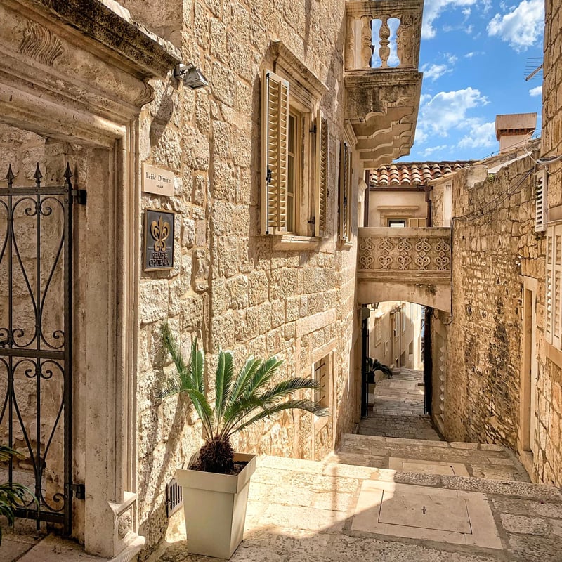 Explorer CroatieLieu de naissance supposé de Marco Polo, cette île fortifiée émerge du canal de Pelješac comme une citadelle médiévale. Les ruelles en arête de poisson de la vieille ville, conçues pour canaliser le maestral estival, serpentent entre palais Renaissance et la cathédrale Saint-Marc, qui abrite un retable du Tintoret. Au-delà des remparts, l'île dévoile forêts de pins, criques isolées et vignobles de Pošip et de Grk — cépages blancs endémiques introuvables ailleurs.