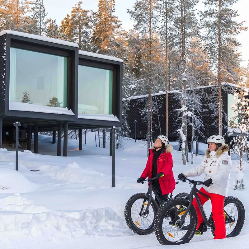 Sur une colline boisée du cercle polaire, des chalets géométriques en bois s'alignent face au nord, leurs immenses baies vitrées placées au pied du lit pour contempler les aurores boréales sans quitter les draps. Chaque cabine dispose d'un sauna privé ; le restaurant décline gibier lapon — élan, renne — et produits arctiques. Le village du Père Noël s'atteint en traîneau, ravissant les familles en quête d'enchantement hivernal.