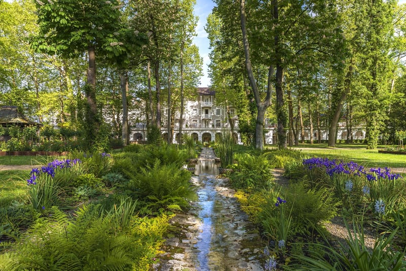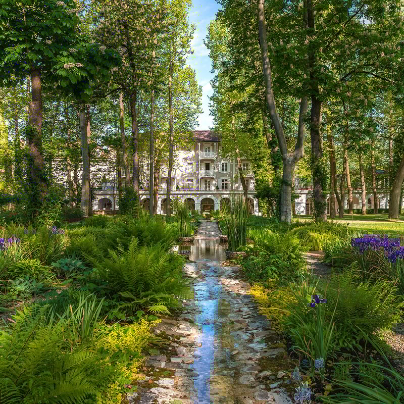 Dans le village thermal d'Eugénie-les-Bains, aux portes des Pyrénées, un palais du XIXe siècle perpétue l'héritage du chef Michel Guérard et sa cuisine minceur révolutionnaire — des repas d'exception qui allègent autant qu'ils enchantent. Lits à baldaquin, mobilier ancien et jardins de magnolias composent un décor d'élégance rustique, tandis que le spa exploite les sources naturelles et ses célèbres bains de boue céramique.