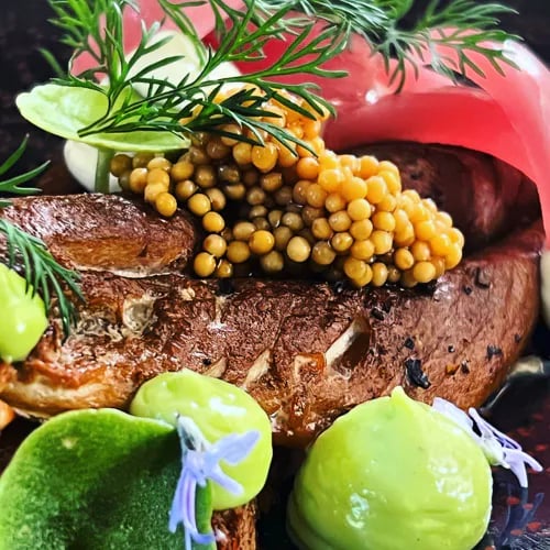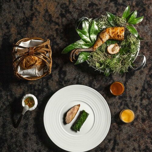 Stéphan Paroche et Justine Viano orchestrent une table étoilée où les compositions végétales révèlent toute l'étendue de leur maîtrise technique, des amuse-bouches aux entrées marines. Leur écrin Art déco des années 1920, prolongé d'une rotonde aux courbes florales habillée de matériaux naturels, accompagne des menus surprises qui célèbrent le terroir. La carte des vins puise généreusement dans le Languedoc, le Roussillon et la vallée du Rhône.