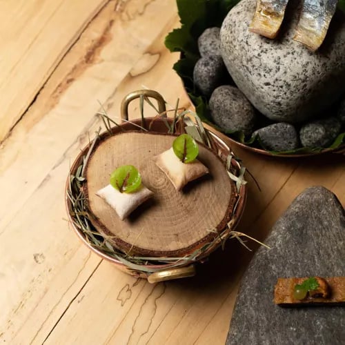 Dans un presbytère du XVIIe siècle aux portes de Béziers, Äponem cultive sept potagers en permaculture qui alimentent une cuisine de marché récompensée par une Étoile Verte Michelin. La salle ouvre sur un panorama de collines languedociennes, tandis que la terrasse ombragée de glycine accueille les déjeuners d'été. Le nom signifie « bonheur » en langue Pataxó—une promesse tenue à chaque assiette.