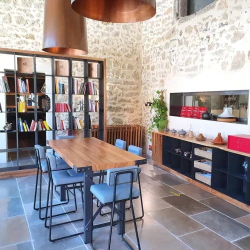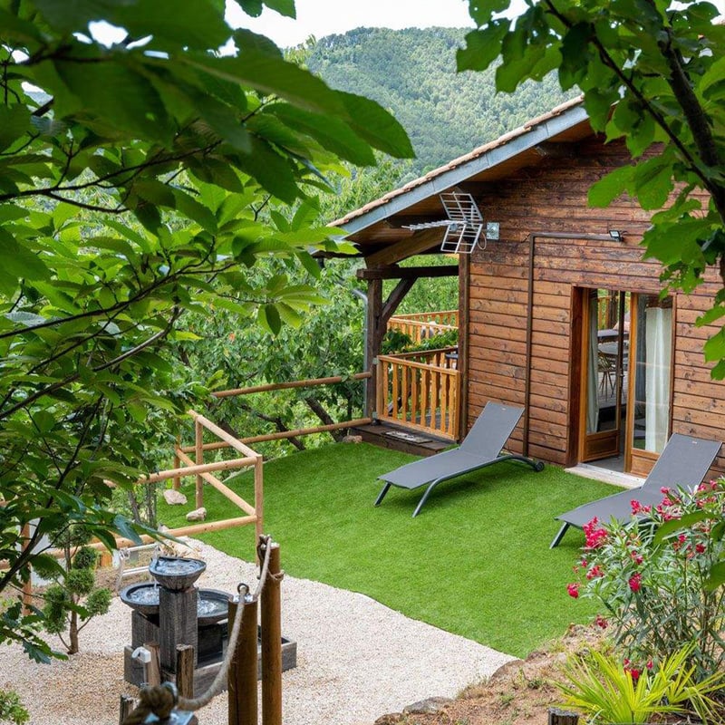 Dix chambres dispersées sur un domaine boisé de l'Ardèche, chacune dotée d'une terrasse privée dominant la vallée. Murs de pierre apparente, mosaïques colorées et objets chinés aux quatre coins du monde composent un décor personnel et chaleureux. Une tour du XIXe siècle abrite le spa—sauna, hammam, jacuzzi dans l'épaisseur des murs anciens—tandis que la piscine extérieure capte la lumière méridionale. Pour ceux qui cherchent l'isolement sans renoncer au raffinement.