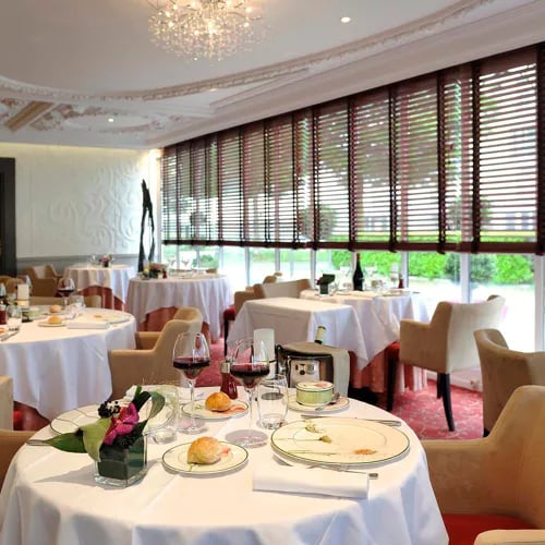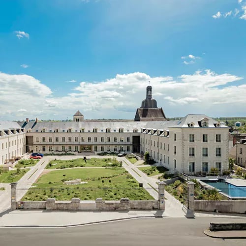 Ancien hospice du XVIIe siècle dominant la Loire, ce domaine de 44 chambres porte l'empreinte du chef doublement étoilé Christophe Hay, formé chez Bocuse. Sa Carpe à la Chambord, écrevisse et truffe, célèbre un terroir qu'il cultive en permaculture et élève en Wagyu. Caroline Tissier a décliné gris poudrés et bleu canard en écho au fleuve. Le spa Sisley de 500 m² et le bistrot Amour Blanc, ouvert sur les eaux par de vastes baies, achèvent cette parenthèse ligérienne.