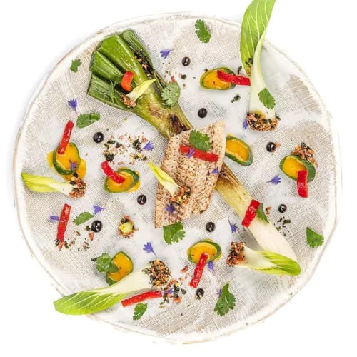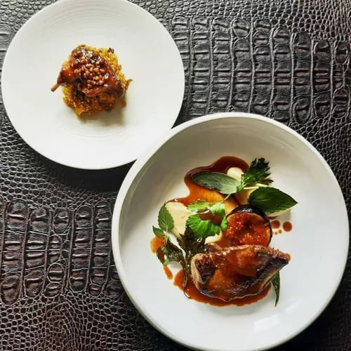 Sous la charpente d'une ancienne grange reconvertie en salle élégante et contemporaine, le chef Alexis Letellier orchestre une cuisine étoilée d'une précision remarquable. Ses menus dégustation déclinent des produits d'exception rehaussés d'herbes fraîches du jardin, accompagnés de jus profonds et généreux. En salle, la sommelière Alice Letellier prodigue des conseils avisés, insufflant à chaque repas une atmosphère joyeuse et complice.
