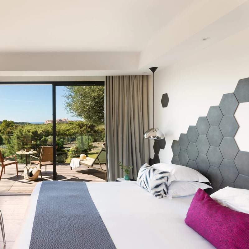 Seul établissement de l'île privée de Cavallo, accessible en quinze minutes de bateau depuis Bonifacio, cet hôtel construit en granit local disperse ses bungalows face à la Sardaigne. Une plage de sable blanc, un spa doté d'une piscine de thalassothérapie et le restaurant Shore Club — où cuisine française et accents italiens se répondent — composent une retraite méditerranéenne idéale pour familles et couples en quête d'isolement préservé.