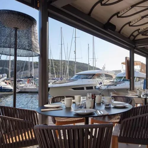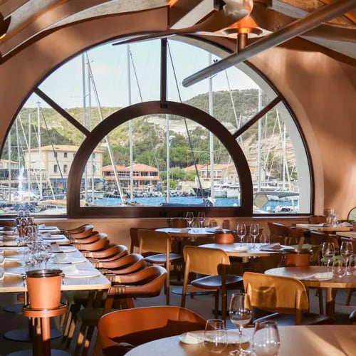 Dominant le port depuis une salle aux lignes évoquant une coque renversée, cette table étoilée célèbre le dialogue entre Corse et Sardaigne sous la direction d'Italo Bassi. Le chef, présent également de l'autre côté du détroit, signe une cuisine aux produits locaux rigoureusement sélectionnés — ses raviolis doubles, burrata et pintade en crème de parmesan, illustrent cette alliance insulaire avec une maîtrise remarquable.