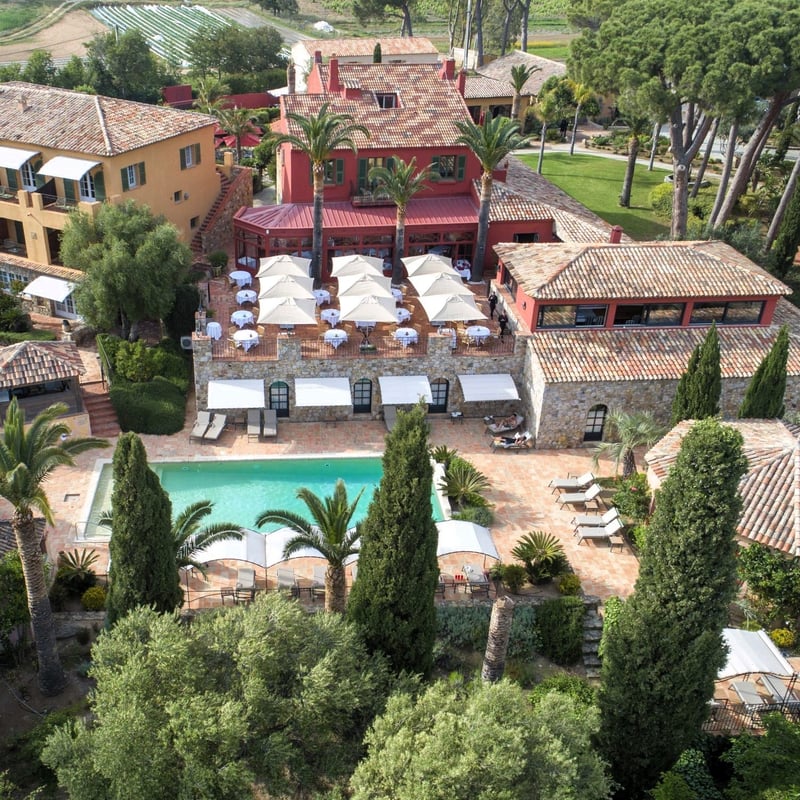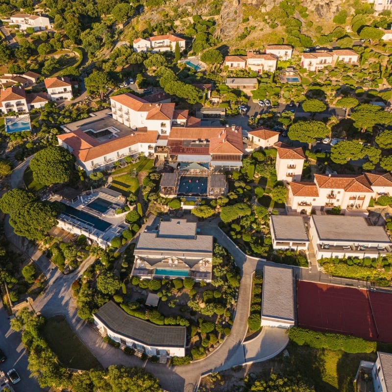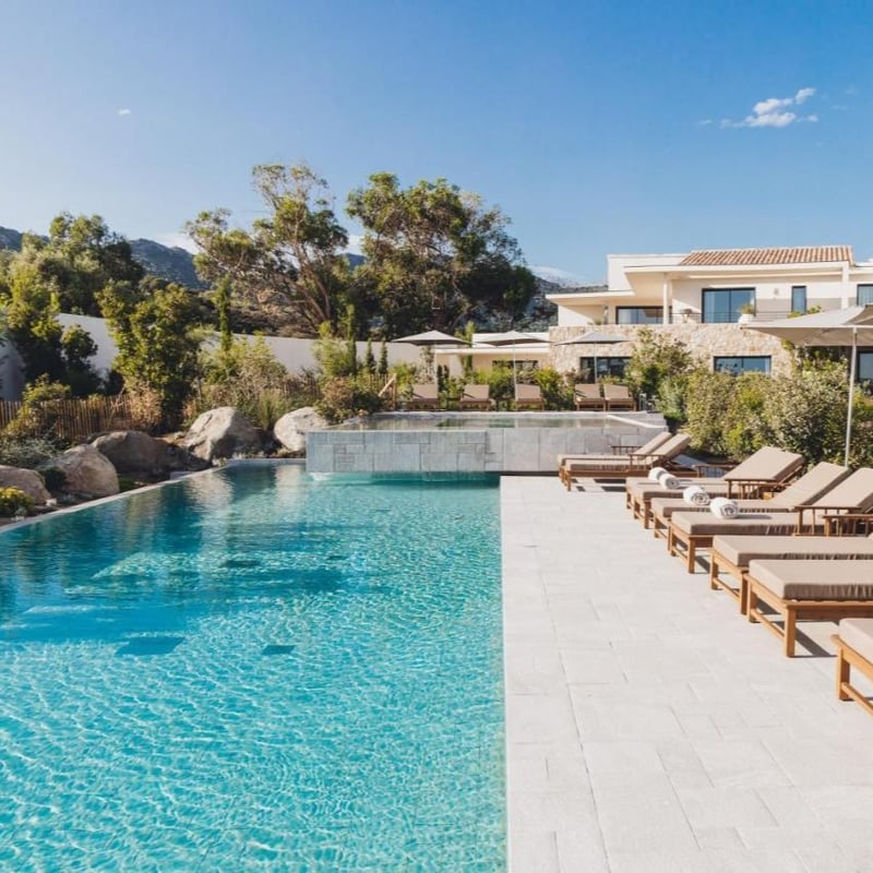 À quelques minutes de L'Île-Rousse, cette adresse de dix-sept chambres signée Christophe Pillet déploie une architecture basse aux lignes épurées, fondue dans des jardins méditerranéens. Chaque chambre s'ouvre sur une terrasse privative tournée vers la végétation ou l'horizon marin. Deux piscines à débordement, chauffées toute l'année, bordent le restaurant où la cuisine suit le rythme des saisons corses.