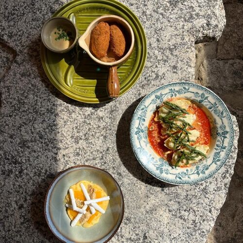 Ancien moulin reconverti au creux du vallon du Reginu, cette table corse déploie sa terrasse-jardin face au golf, loin de l'agitation littorale. La carte puise dans le garde-manger de la Balagne—poissons locaux, légumes biologiques—pour livrer des assiettes comme les arancini de crevettes, bisque froide et pois gourmands. Distinction Assiette Michelin à l'appui, l'adresse conjugue authenticité régionale et sérénité champêtre.